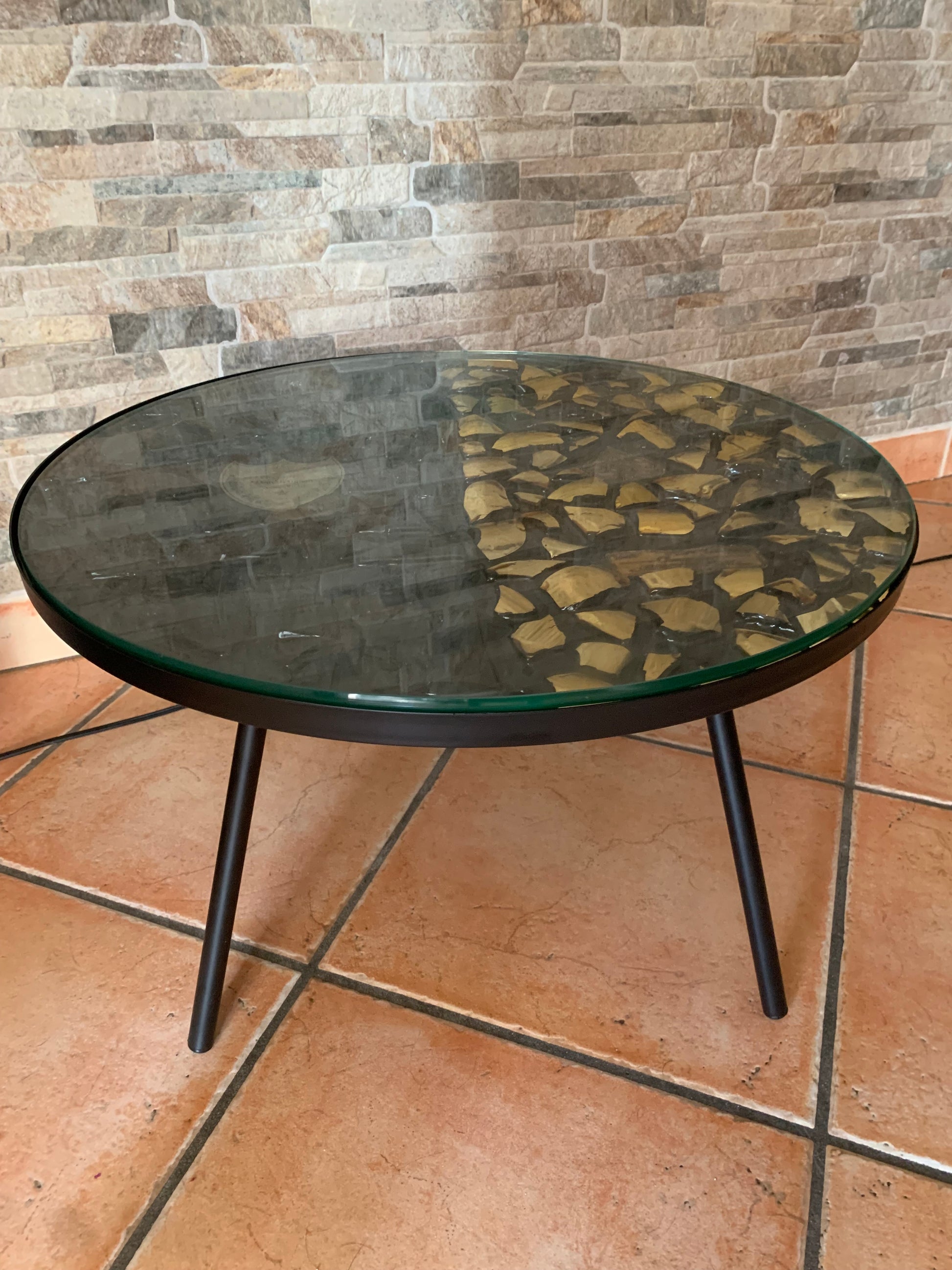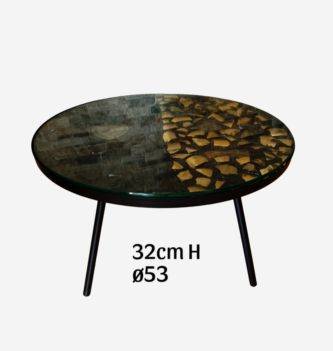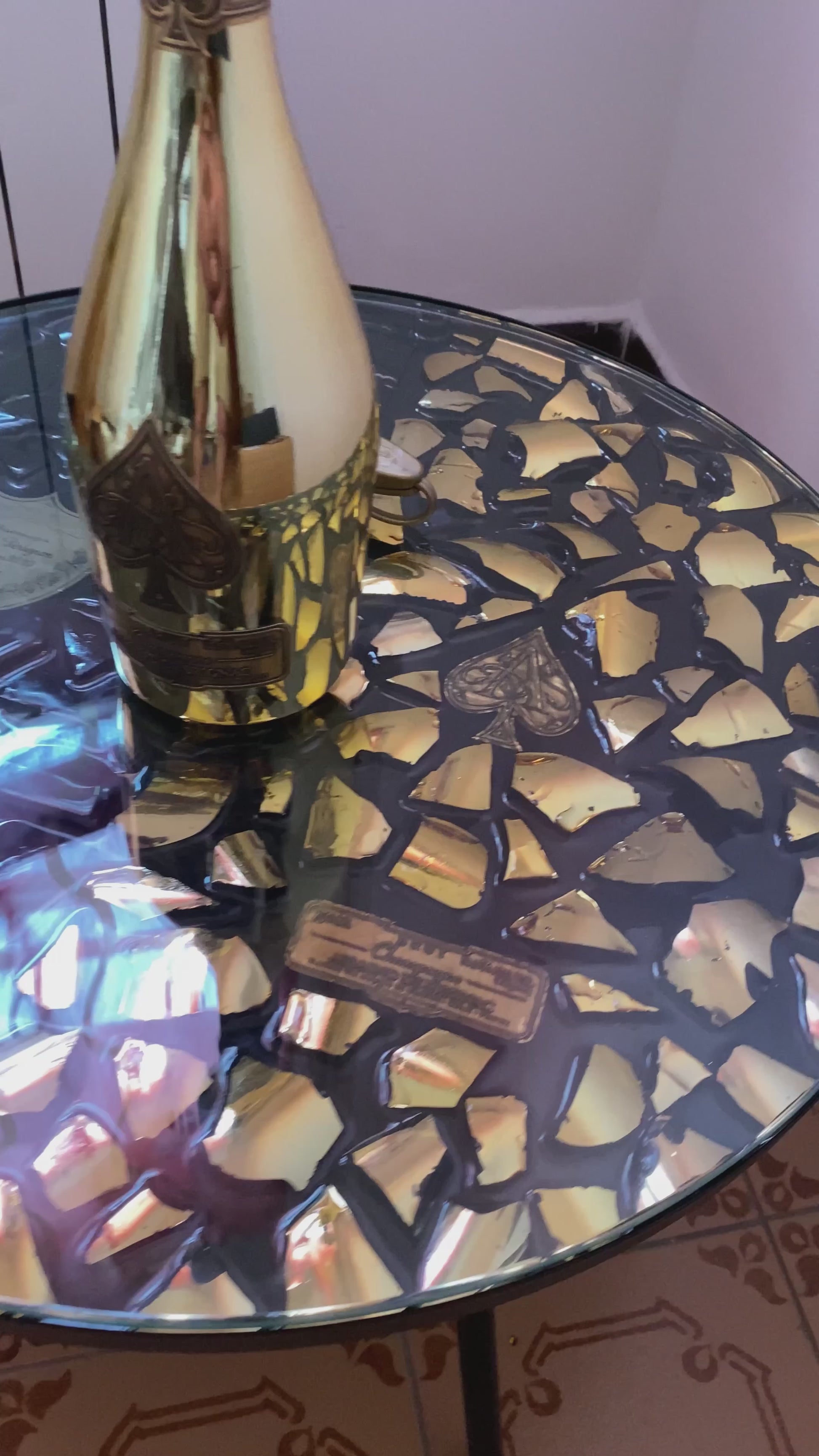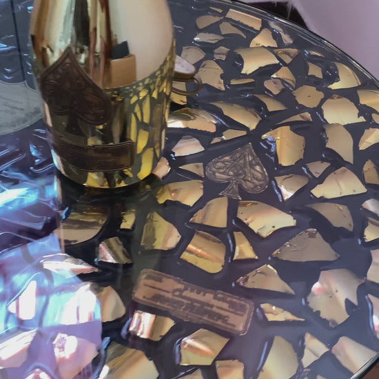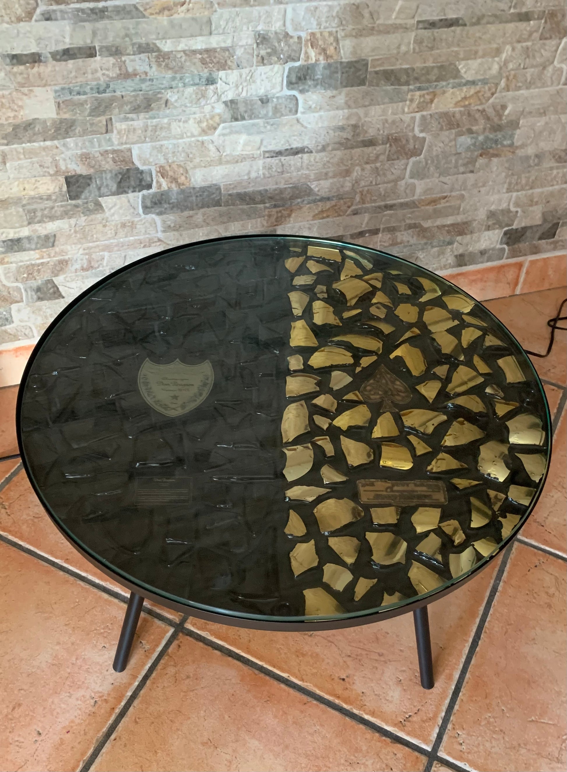 Tavolo artigianale di ottima qualità, realizzato con una bottiglia di Dom Pèrignon Vintage, Armand de Brignac Gold e Resina.